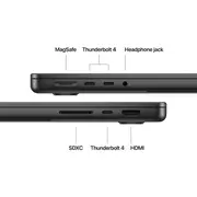 Connectivity — Three Thunderbolt 4 ports, HDMI, SDXC card slot, MagSafe 3, and headphone jack.