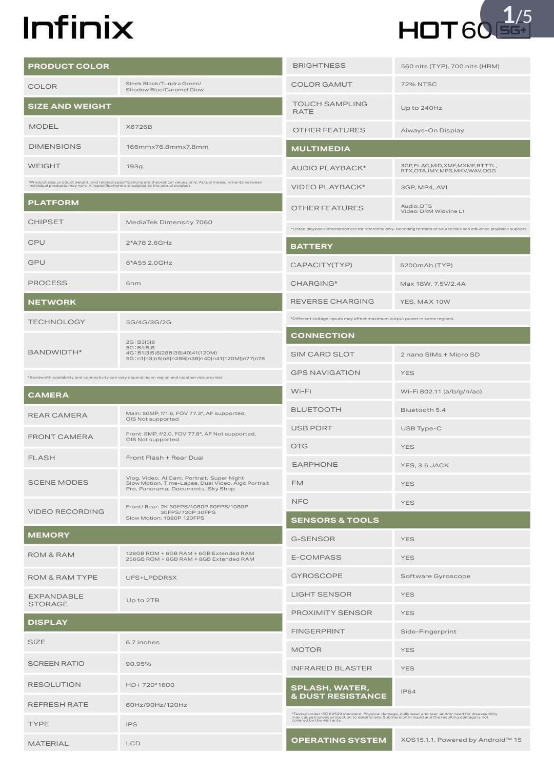 Experience speed, style, and performance with the Hot 60 5G+. Featuring a sleek matte gradient finish in stunning Tundra Green, this smartphone combines premium design with cutting-edge technology.
